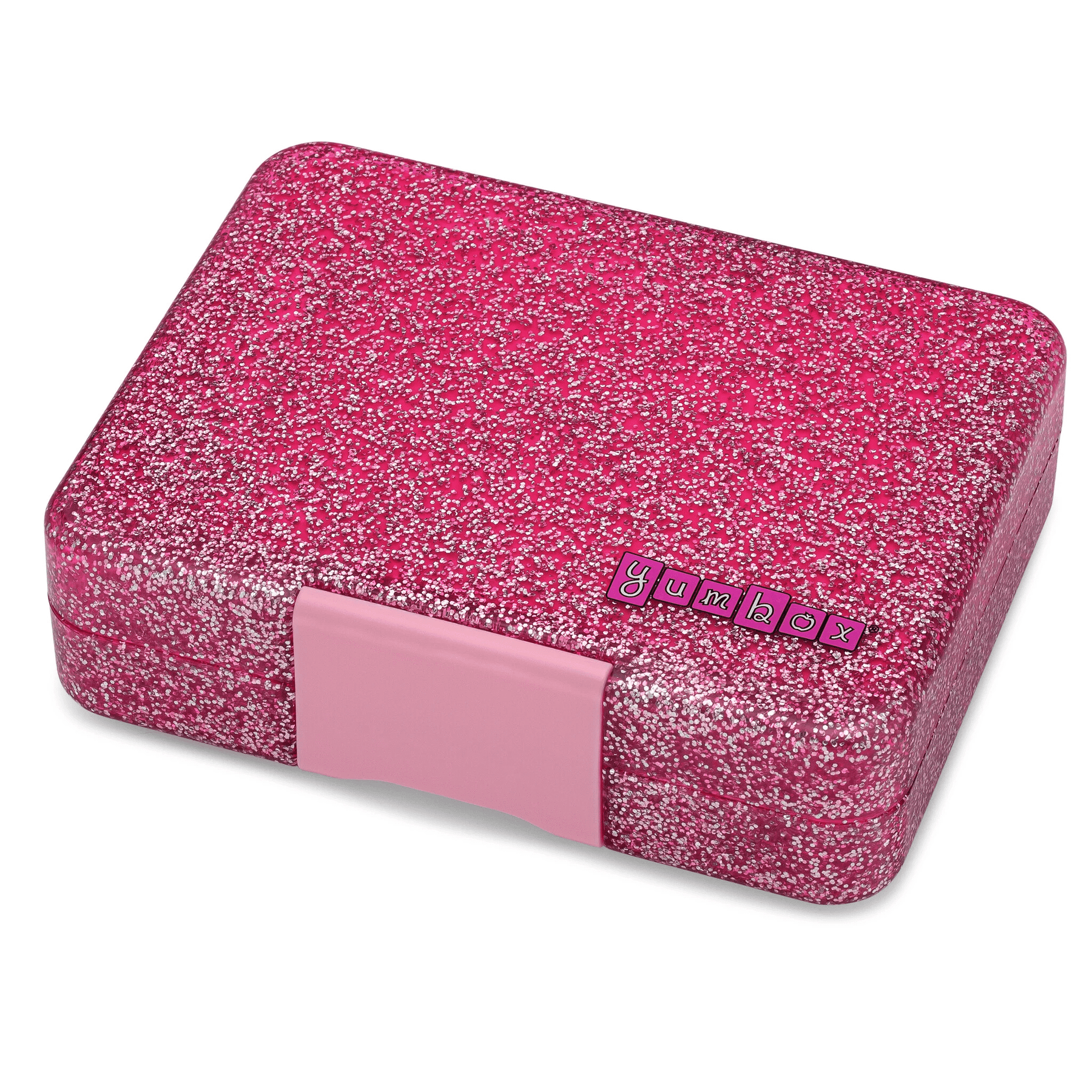 Smuk glitter-pink snack madkasse fra Yumbox med logo. Rumdeler med 3 forskellige rum i elegant clear pink design. Bakken er udtagelig og tåler opvaskemaskine på max 65°.
